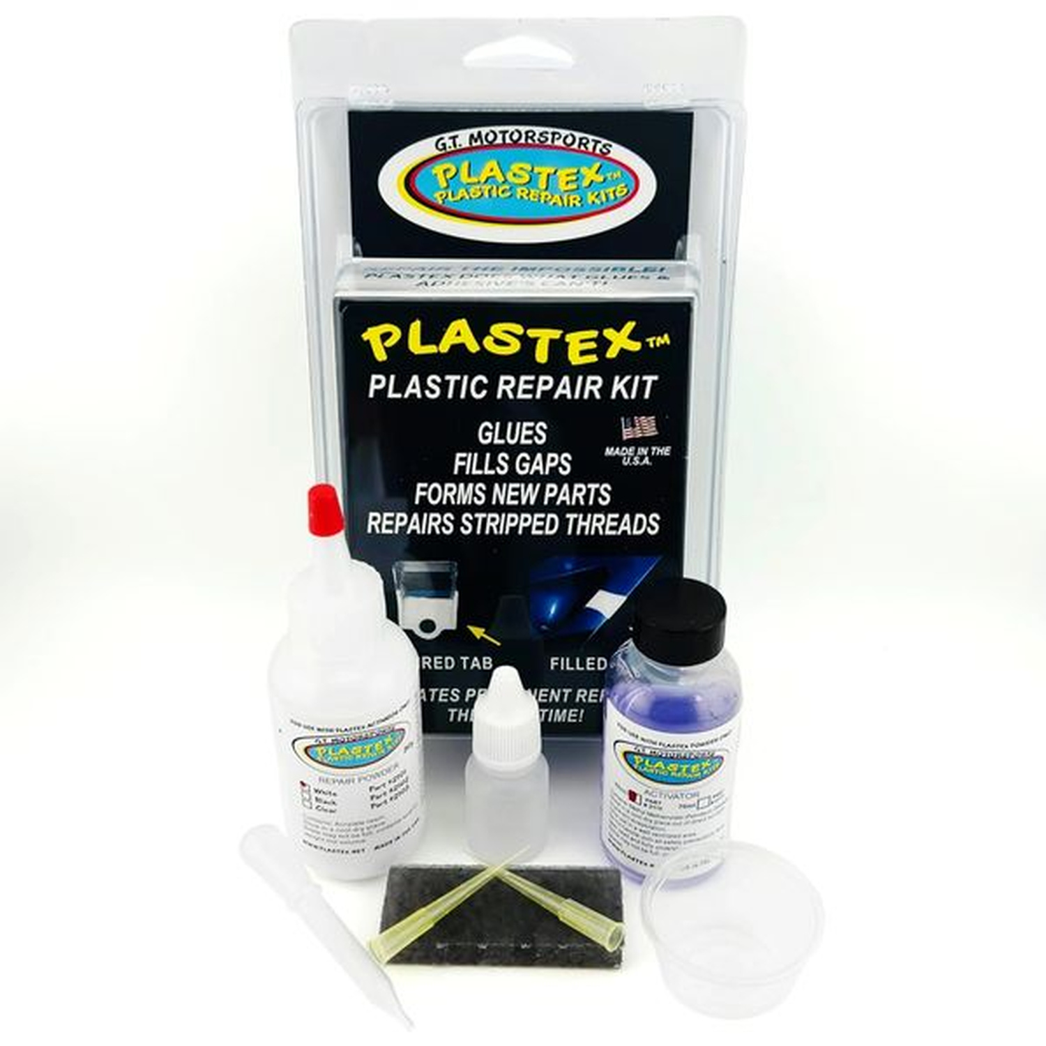 Standard Kits are of our biggest sellers and best values. This size will kit will repair approx. 6 tab repairs or 15″ inches of crack repairs. Great for around the house or office. Kit Includes: 30 grams of repair powder in color choices of White, Black, Clear, Yellow, Orange, Red, Green, Blue or Gray. 50ml activator 1-molding bar 1-applicator bottle, 1-powder cup, 2-applicator tips, 1-small transfer pipette.